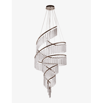 La suspension LED ZEMA incarne le luxe contemporain avec une silhouette en spirale double, habillée de verre taillé suspendu sur une structure en métal finition gold rose. Ce modèle d’exception transforme les grands volumes en décors somptueux.