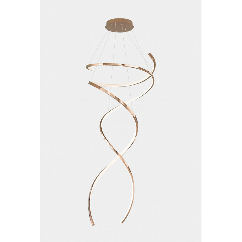 Suspension design double hauteur avec LED intégrée. Finition gold rose, idéale pour grandes hauteurs sous plafond. Structure en métal, lumière chaude 3000K. Format imposant (250 x 75 cm), parfaite pour hôtels, escaliers ou entrées de villas luxueuses.